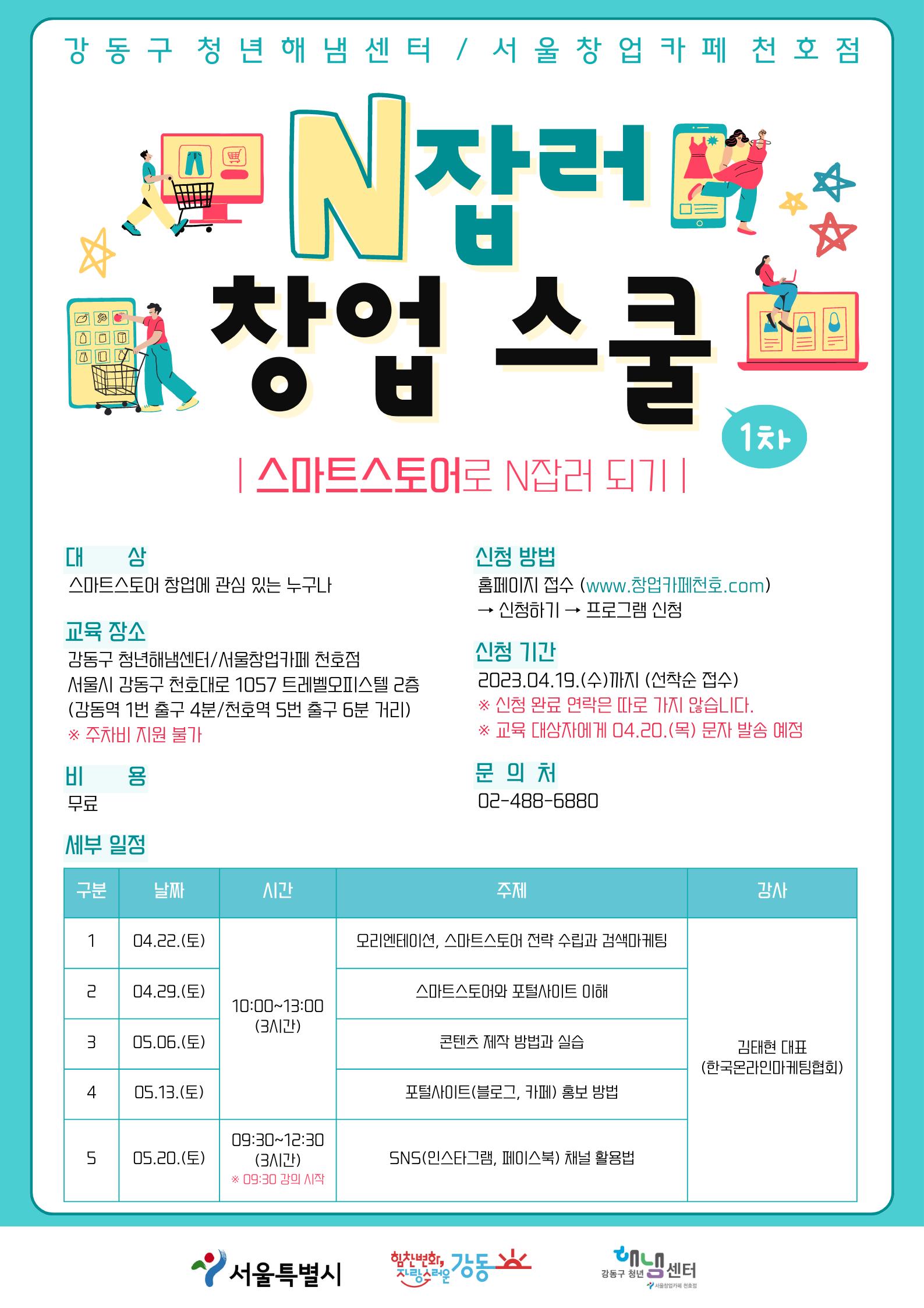 상단 공고에서 세부일정을 확인해보시고, 강동구 청년센터에서 무료로 스마트스토어 강의를 준비했으니 꼭 신청하셔서 스마트스토어 N잡에 도전해보시길 바랍니다.