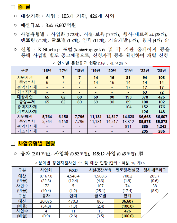 2023년 창업지원사업 통합공고 리스트 다운로드